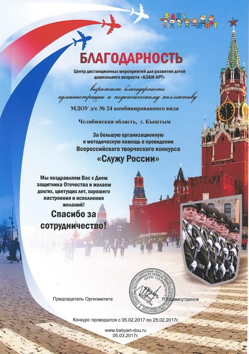 Педагоги нашего детского сада приняли участие во Всероссийском творческом конкурсе "Служу России". Центр дистанционных мероприятий для развития детей дошкольного возраста "БЭБИ-АРТ" выражает благодарность педагогическому коллективу за участие в конкурсе.